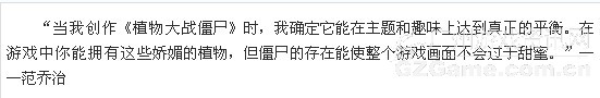 “没错,这是一个关于僵尸的游戏,但都是些笨笨的卡通僵尸,所以不会有恐怖的感觉”,范乔治在接受媒体采访时说,“做这个游戏只是出于个人喜好而已。我不会把游戏设计看得过于严肃,但也不会随意迎合玩家的低级趣味。所以当我开始创作《植物大战僵尸》时,我确定它能在主题和趣味上达到真正的平衡。在游戏中你能拥有这些娇媚的植物,但僵尸的存在能使整个游戏画面不会过于甜蜜。”
