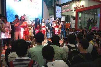 Chinajoy上不仅有美女可看,更有众多的游戏周边可拿。只要参加活动基本就可以轻松拿到,有些玩家是拿过这家去那家,基本上是跑完了所有展台,真是恨不得拿完所有周边。但是有些大奖可不是那么容易拿的,在一起手游网承办的手机网游专区展台前,众多的玩家为了拿到联想手机大奖,就引发了千人同竞的场面。