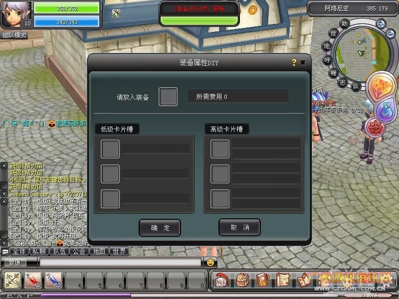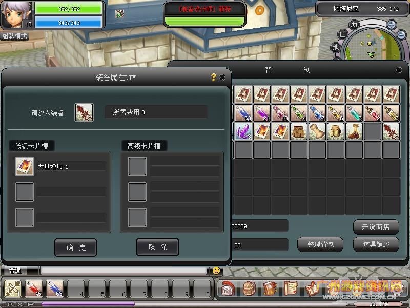 首先,身上带了足够的游戏币,每一次镶嵌卡片都是需要游戏币来支持的。再要有一张卡片,先不要管什么属性,比如我这张精致嗜血者,属性是力量增加1。找到“装备设计师”,他在阿塔尼亚的东北角,坐标是385 179。右键点击他,会弹出一个对话框,选择装备属性DIY。是不是看见装备属性卡片的界面了?现在我们把武器放上去——按B键打开包裹,把武器拖到最上方的格子里。我的武器已经镶嵌了一张精致嗜血者的试炼了,没关系,还可以再镶嵌两张。当然了,你可以在低级卡片槽里面镶嵌任何一张,完全不同属性的低级卡片,高级也是这样。因为低级卡片槽有3个。现在再把要镶嵌的卡片从背包里拖到相应的卡片槽里面去,然后点确定。就这样,镶嵌成功了。卡片镶嵌是没有失败几率的。但是对于低级卡和高级卡一个装备只能镶嵌3个,即3张低级卡和3张高级卡。卡片镶嵌好了之后不会对装备的要求提高或者降低,唯一的作用就是给镶嵌了卡片装备的持有者带来属性的提升。