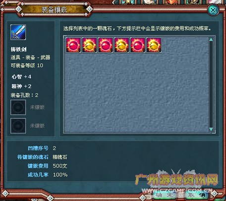 在镶嵌魂石界面,左侧为装备的属性,右侧为所拥有的魂石数量和种类,下方为镶嵌槽孔的顺序、待镶嵌的魂石、镶嵌费用以及成功几率。选择所要镶嵌的魂石,点击确定即可。