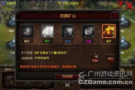 挖矿活动每天都可以进行四次。玩家只需要点击日常活动,从列表中选中“挖金矿”,点击进入挖金矿主界面就可进行挖矿操作。点击界面下方挖矿按钮,可调出 寻矿界面。矿产品质从低到高总共分为五种,晶石、银矿、宝石、水晶和金矿,越高级的矿产产出的金币和宝石等级就越高。当矿产品质不合心意时,玩家也可以通 过点击寻找按钮来更换矿产品质(成功则提升一级矿产品质,否则减少一级),矿产中包含大量金币以及宝石,开采高级矿脉,更是可以得到高级绝品宝石,穿金带银,华丽闪闪,纵横莱尔大陆!