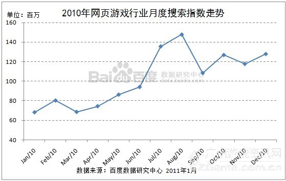 仅仅2010年网页游戏则全年搜索达12亿次,月搜索从0.69亿增长到1.3亿的倍数跨越,暑假期间8月份的搜索指数更是达到了1.5亿。