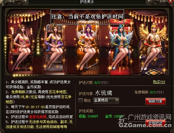 尽管护送美女是全天开放,但是在16:00-17:00是双倍护送哟,所以不管你是大R还是小R还是非R都是不错的选择哟。