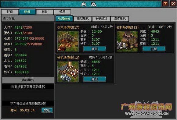 1、资源建筑:包含伐木场、石料场、铁矿场,升级就可以提高资源的采集效率,让你的税收来得快些,不过个人认为这一栏是鸡肋,在游戏中衡量玩家实力的是你的军事水平而不是资源能力,而且如果紧缺资源,可以去各等级的资源采集点采集,速度一点不比升级慢,除非你是资源实在跟不上又觉得采集相当无聊,可以适当的升两点,像我就是木头跟不上,平常大多数时间又在挂校场所以多点了几点伐木场,当然,如果你是小号那就要有多少升多少了,积少成多嘛,而且建筑等级加上你不停的采集,来钱的速度那是相当可观的。